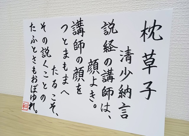 清少納言「枕草子」の説経の講師は、の段です。 縦約19cm、横約27cmです。 サイズ変更や、「この和歌や漢詩を書いてほしい」などのご注文も可能です。 発送は普通郵便、発送料込みの金額に設定しております。