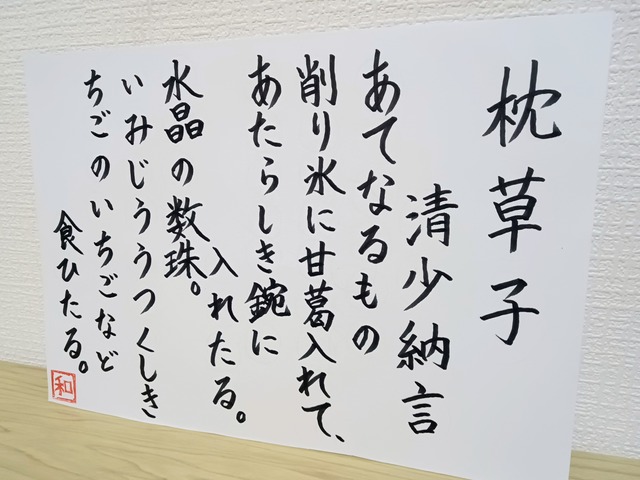 清少納言の「枕草子」、あてなるものの段です。 縦約19cm、横約27cmです。 サイズ変更や、「この和歌や漢詩を書いてほしい」などのご注文も可能です。 発送は普通郵便、発送料込みの金額に設定しております。