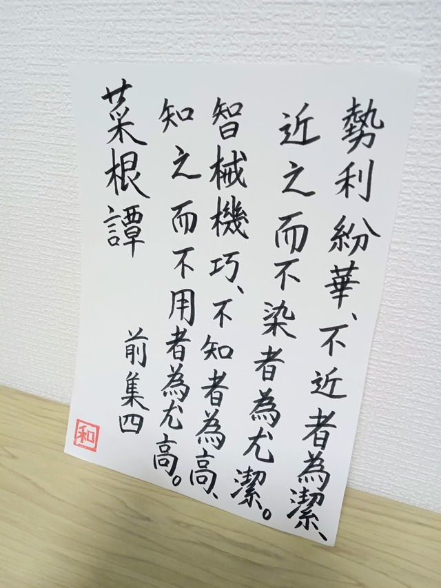 東洋思想の「菜根譚」の、前集四です。 縦約24cm、横約18cmです。 サイズ変更や、「この和歌や漢詩を書いてほしい」などのご注文も可能です。 発送は普通郵便、発送料込みの金額に設定しております。