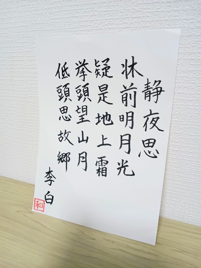 李白の漢詩、「静夜思」です。 縦約24cm、横約18cmです。 サイズ変更や、「この和歌や漢詩を書いてほしい」などのご注文も可能です。 発送は普通郵便、発送料込みの金額に設定しております。